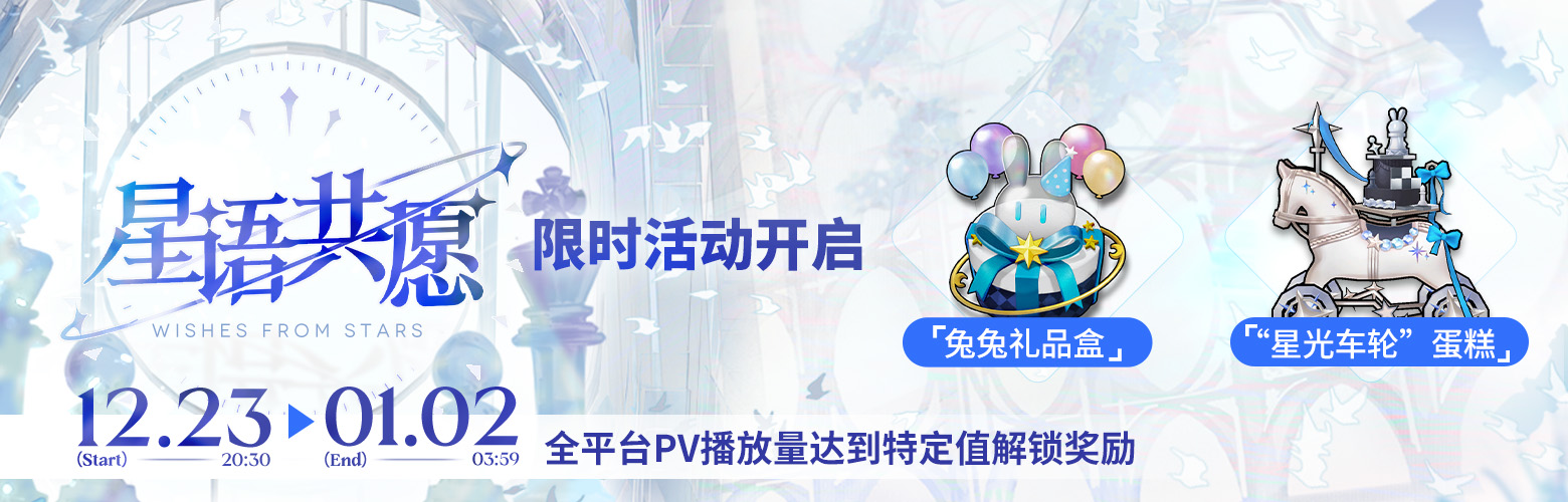 活动说明:活动期间内,全平台PV播放量达到特定值可解锁兔兔礼品盒×2(使用后随机获得指定养成素材)、可交互家具、养成素材、家具零件等奖励