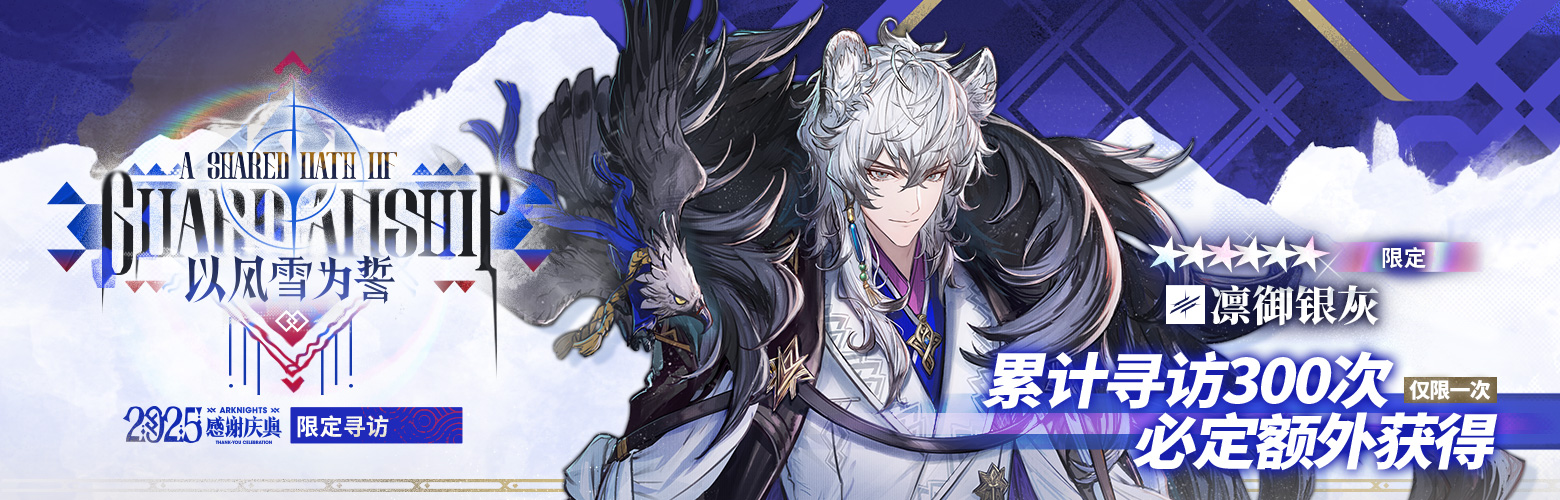 在本期【限定寻访】中,累计寻访300次,可以额外获得限定干员凛御银灰(仅限一次)。该次6星限定干员的获取是额外赠送,不产出【寻访数据契约】,同时也不会影响本期【限定寻访】获得下一个6星干员的概率,该累计次数会在本期【限定寻访】的结束时清零(后续【春节】、【庆典】、【夏季】系列限定寻访都将应用同类规则,即:寻访300次时,必定有获得1次额外领取当期限定干员的机会。这个规则的计数仅与该限定寻访绑定,不会跨寻访继承)