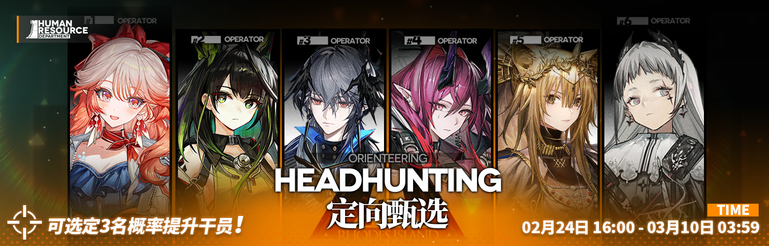 活动说明:活动期间,玩家可在当期甄选的干员范围内自主选择并锁定3名六星干员和3名五星干员作为当期【定向甄选】寻访出现概率提升的干员(当期【定向甄选】可能出现的六星干员仅包括自选概率提升的3名六星干员)