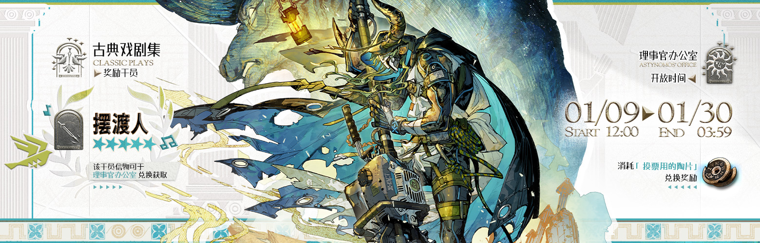 主要奖励:活动干员【★★★★★:摆渡人】、【雅赛努斯的新生诗篇】家具(部分)、模组养成材料、「投票用的陶片」等