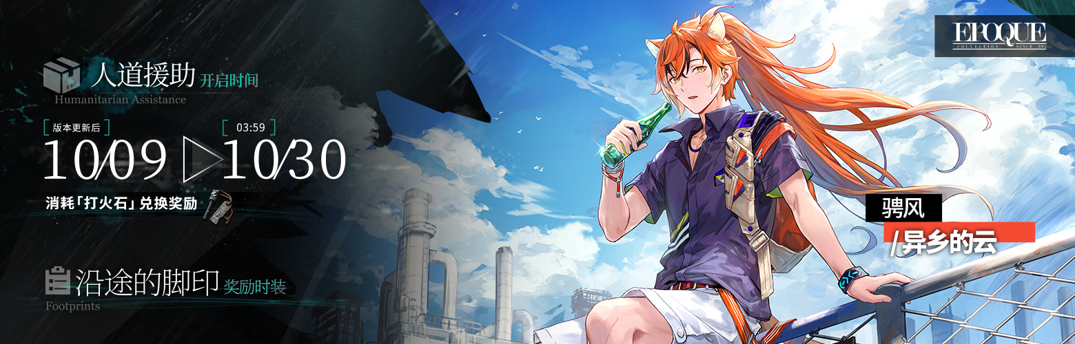 主要奖励:时装【时代系列 - 异乡的云 - 骋风】、饰牌《金血》、高级养成素材、龙门币等